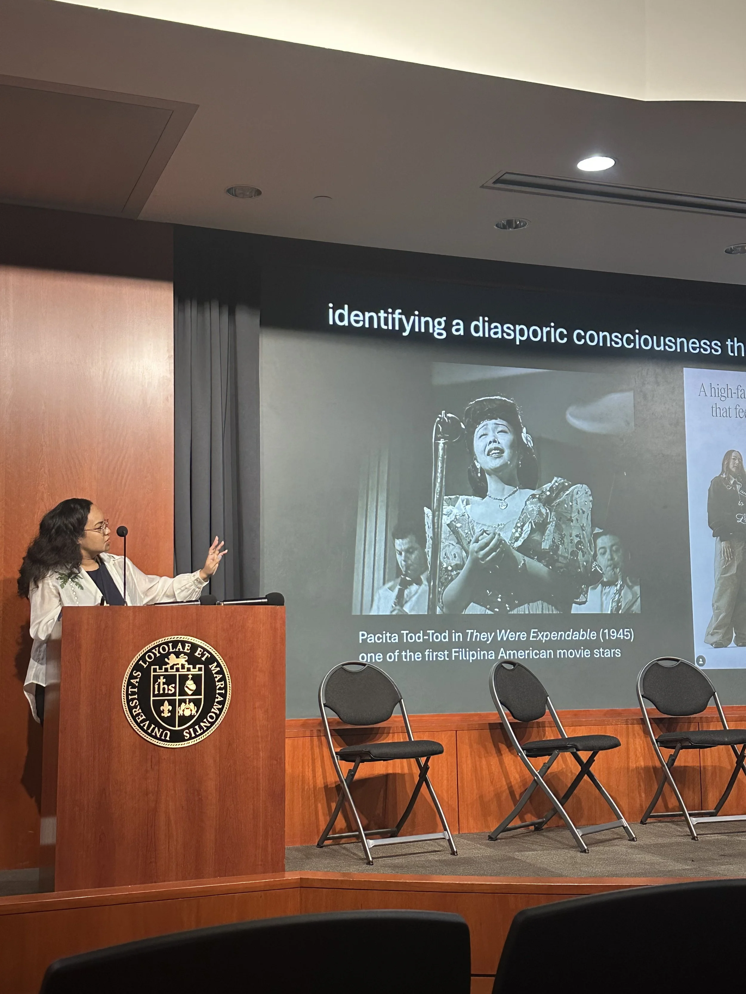 Jaleesa Reed presenting ‘Re-examining the Terno: New Approaches to Dress in the Filipinx Diaspora’ at the 2025 Costume Society of America National Symposium in Los Angeles, California. Image courtesy of Jaleesa Reed.