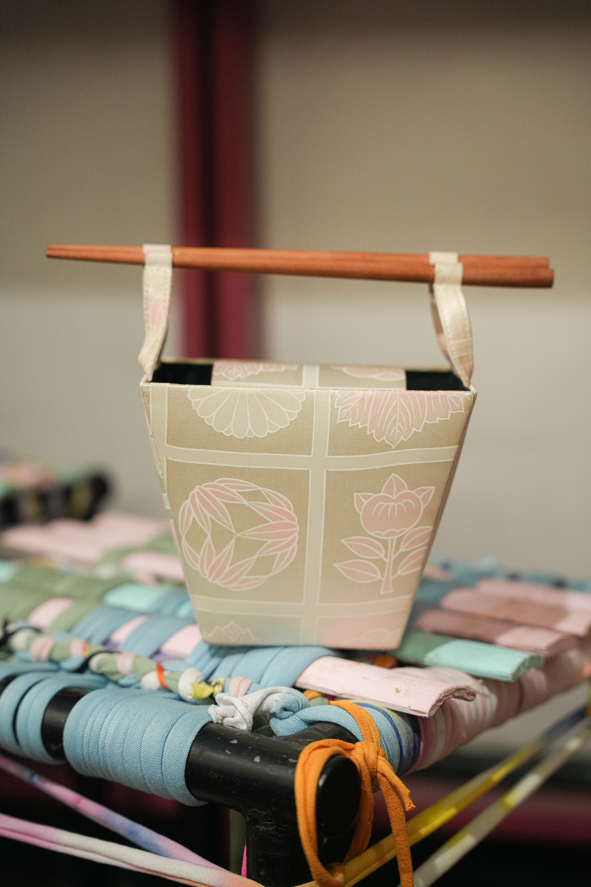 The sisters work with these vintage and deadstock materials, producing small-batch pieces. Their signature piece, the Takeout Bag, a structured, square-bottomed bag that takes its silhouette from a Chinese takeout container. Threaded through with a pair of chopsticks, it has become the label’s most recognisable product, released in a series of fabrics drawn from the same inherited stock, from tartan and brocade to gingham and silk.