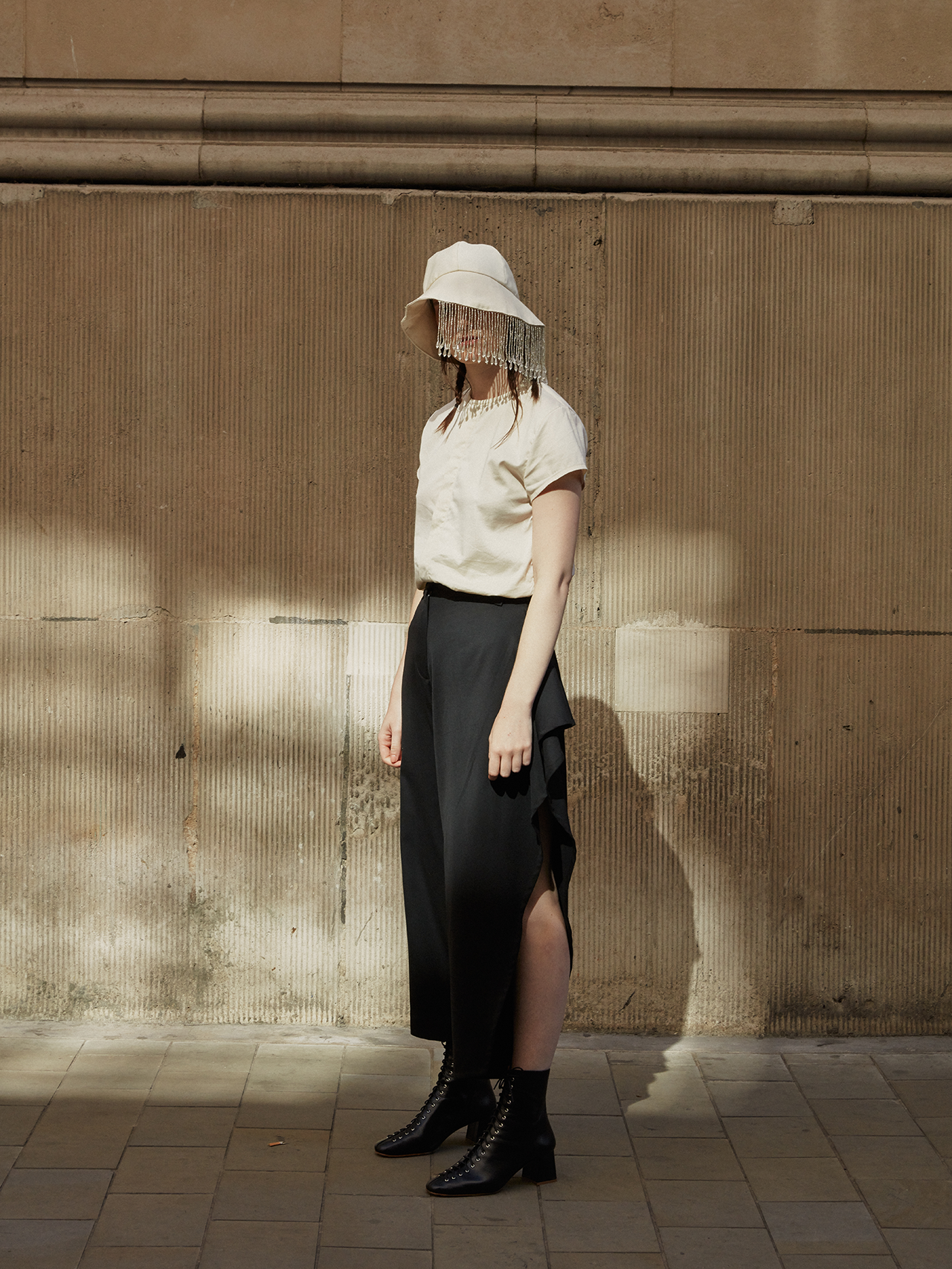 Glass Bead Bucket Hat and Cotton Placket Blouse by Shaofen.