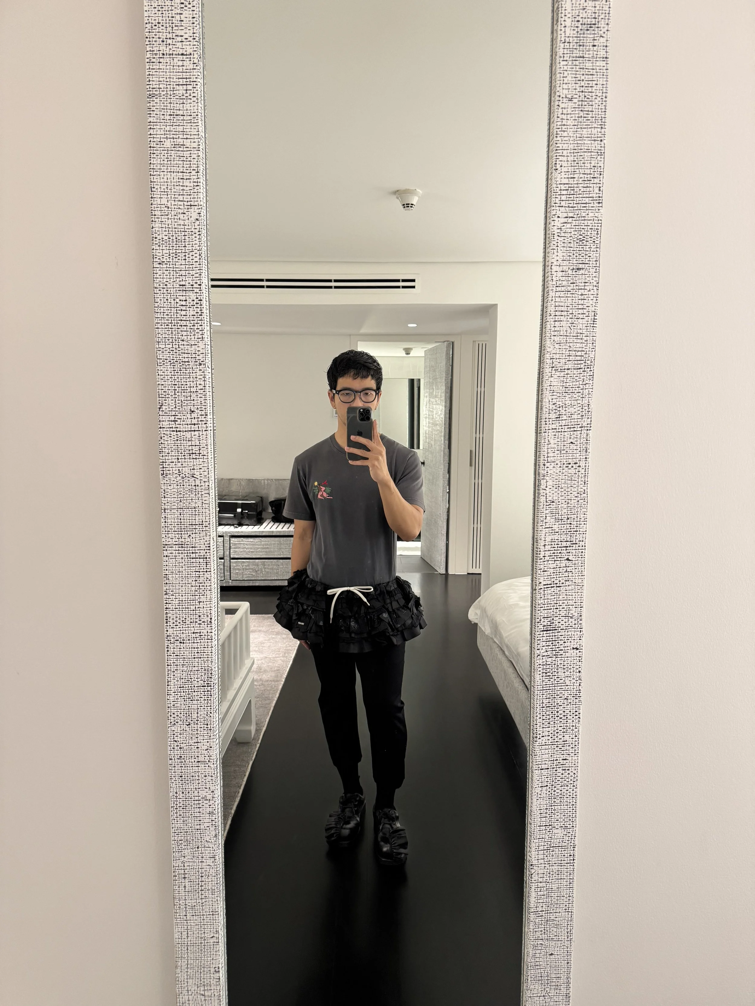 As I was getting dressed, someone tapped me on a dating app and we made a plan to meet for a drink later. Suddenly, the micro skirt felt too much. So I changed into a gray t-shirt and black Sean Sheila high-waisted wide-cut trousers. Simple. Put together. Masc. Ready to trap someone’s heart, or at least his desire.