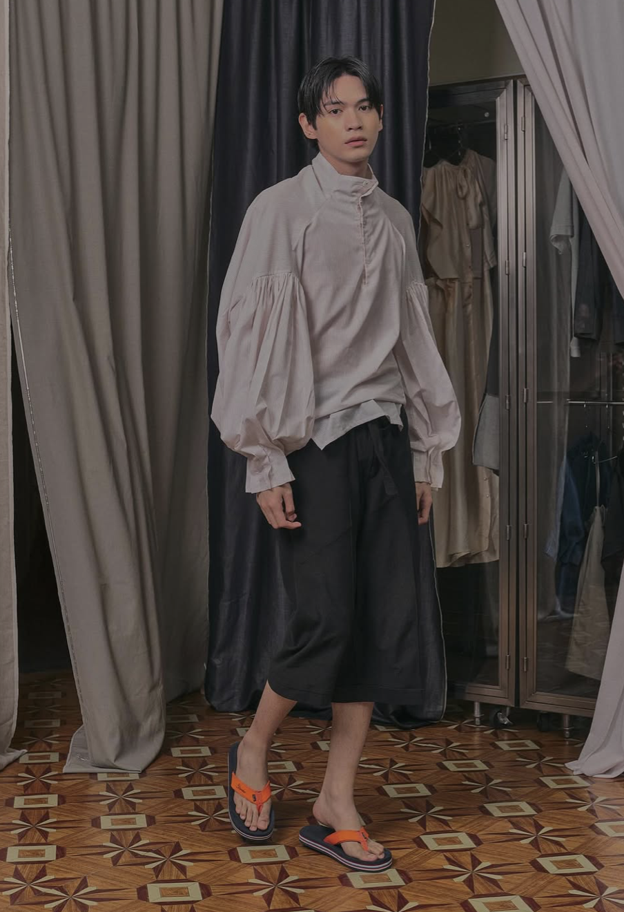 Manila-based designer Carl Jan Cruz has cultivated a practice that reads as both wardrobe and autobiography. Eschewing seasonal cycles, his collections form an evolving vocabulary of garments, where familiar staples are reconsidered through thoughtful details such as raw edges drapery, and shifting proportions. His recent collaboration with multi-label concept store Univers extends this exploration, featuring pieces such as a draped black dress layered over wide denim trousers, and a high-collared shirt with ballooning sleeves styled nonchalantly with cropped trousers.